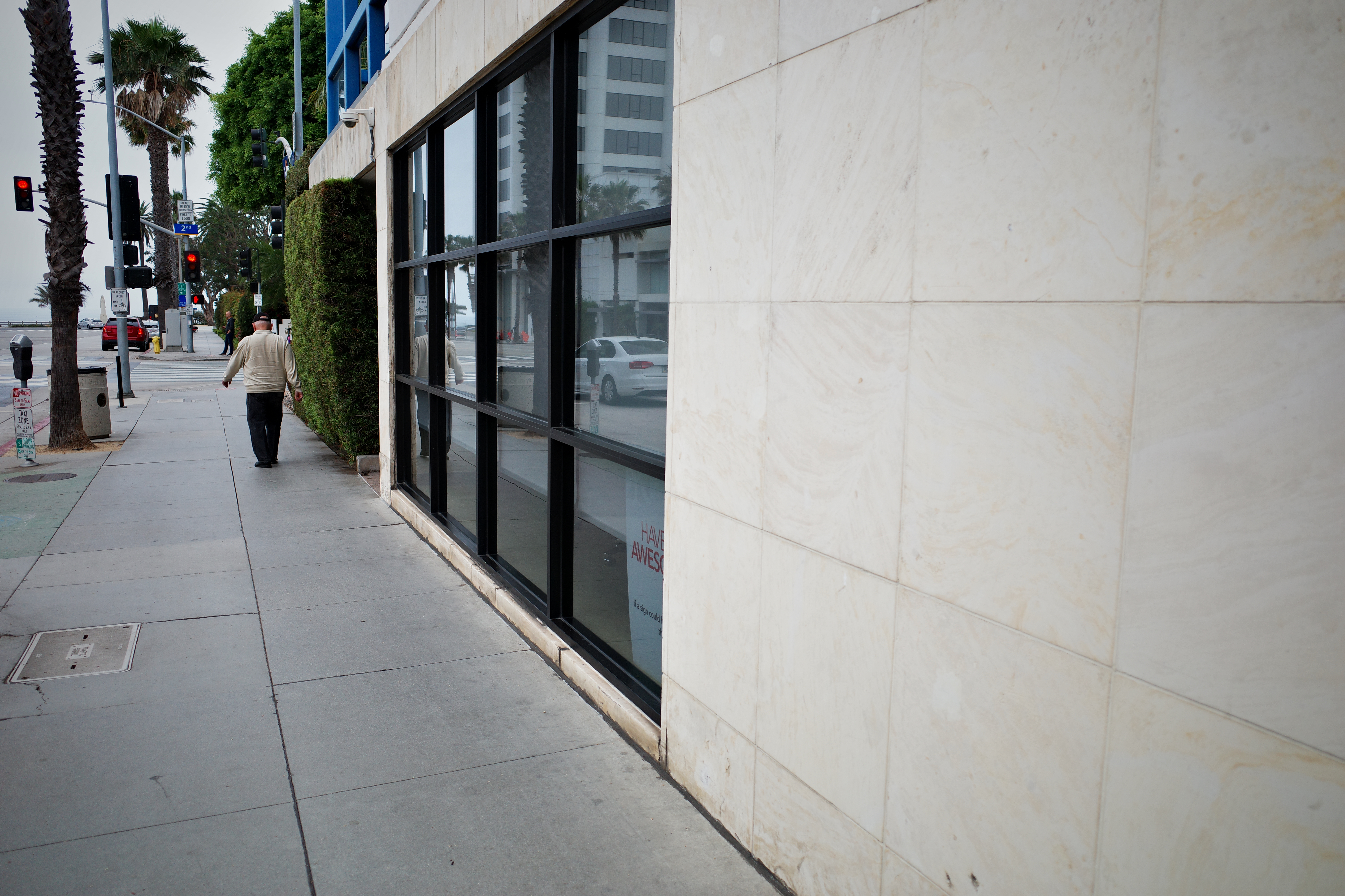 In this photograph, a solitary figure walks along a quiet sidewalk, framed by a stark beige wall and reflections in large windows. The mood is contemplative and somewhat melancholic, emphasized by the soft, diffused lighting that subtly reveals the urban landscape. Tall palm trees and muted colors create a sense of isolation in the midst of the city’s bustle.