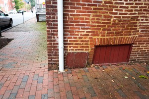 This photograph captures a quiet urban corner where a brick wall meets a patterned sidewalk. The muted colors and rainy ambiance evoke a sense of nostalgia, while the composition draws attention to the textures of the bricks and the painted panels. A solitary white pipe adds a modern touch, contrasting with the historical elements of the scene.