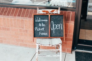 A rustic sign perched on a weathered chair invites visitors into 'The Picket Fence.' The warm, welcoming mood is enhanced by the aged textures and soft sunlight highlighting the chalkboard. Its earthy color palette and inviting words create a sense of nostalgia and charm, drawing in passersby with a promise of local treasures.