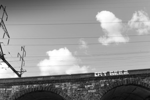 The photograph captures a moody scene featuring a stone arch bridge framed against a dynamic sky, where fluffy clouds contrast with the harsh linearity of overhead power lines. The stark black and white tones evoke a sense of nostalgia and solitude, while the graffiti adds an element of urban grit. The composition draws the eye upward, inviting contemplation of the juxtaposition between nature and man-made structures.
