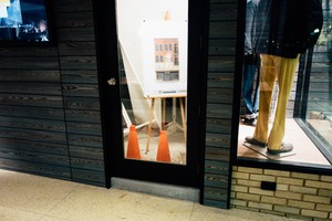 This photograph captures a candid moment in an urban setting, showcasing a doorway framed by sleek wooden panels. The lighting creates a soft, atmospheric glow, casting a reflective sheen on the glass and revealing the contrast between the vibrant colors of the artwork and the subdued tones of the surroundings. The composition invites viewers to ponder the intersection of art and daily life, evoking a sense of curiosity and intrigue.