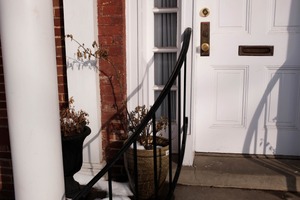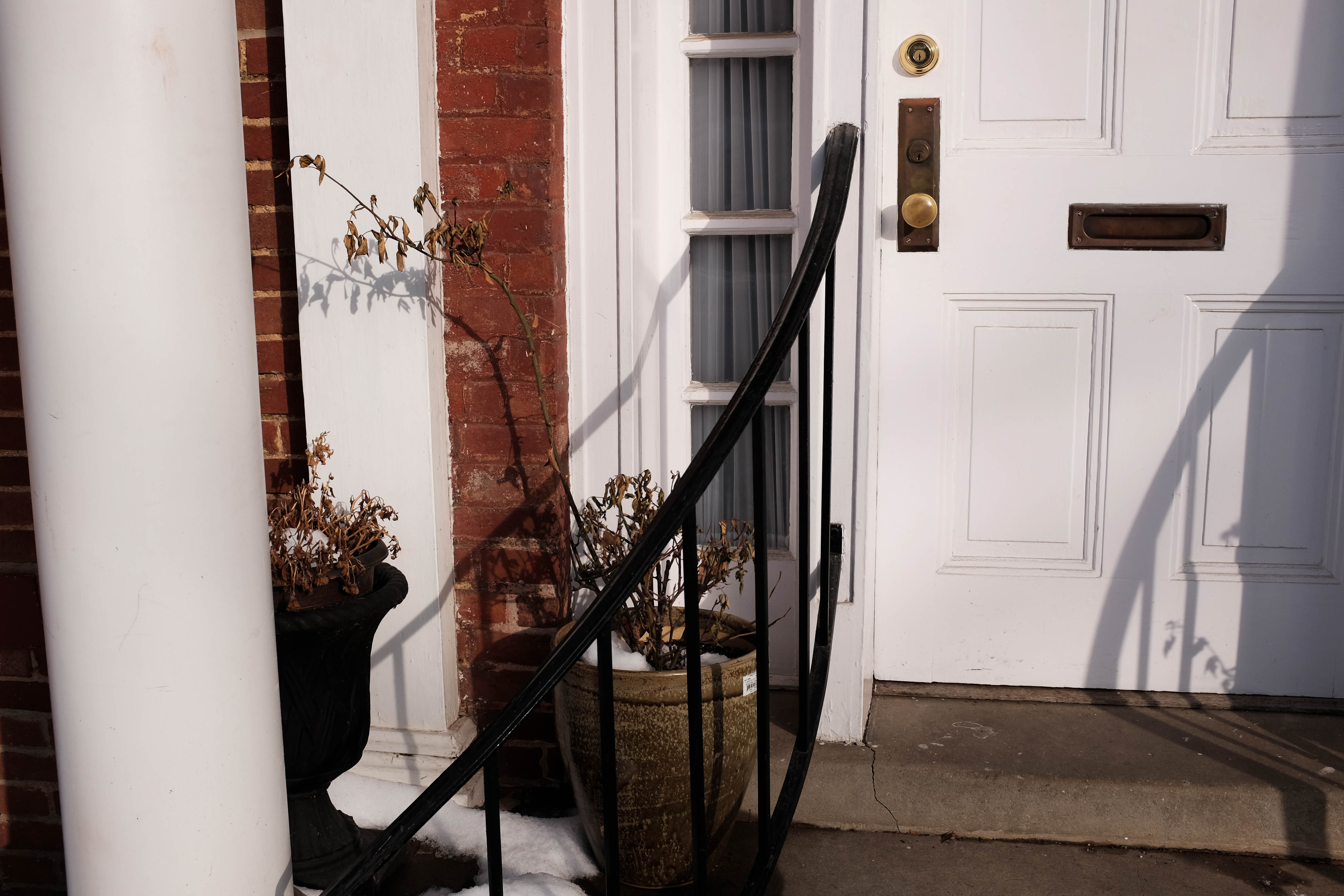 The photograph captures a quaint entrance with a sweeping wrought-iron railing leading to a white door, exuding a sense of calm. Soft morning light casts gentle shadows, accentuating the muted tones of the brick wall and decorative planters that hold dried foliage. The overall mood is peaceful, suggesting a moment of stillness in a familiar, welcoming space.
