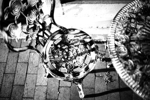 This black and white photograph presents a close-up view of an intricately designed chair, showcasing ornate floral patterns that evoke a sense of vintage charm. The play of light and shadow creates a moody ambiance, emphasizing the reflective surfaces and textured details of the metalwork. The composition draws the eye inward, creating a focal point that reflects a serene yet nostalgic atmosphere.