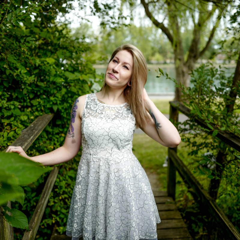 A young woman stands gracefully on a wooden pathway surrounded by lush greenery. Her confident smile and soft demeanor harmonize with the tranquil background, creating a serene atmosphere. The natural lighting gently illuminates her features, enhancing the delicate details of her dress and tattoos, inviting a sense of calm and beauty.