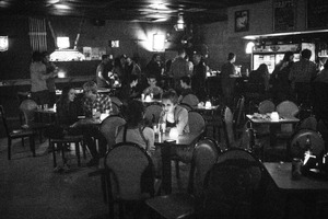 The photograph captures a lively bar scene infused with a moody atmosphere. Soft candlelight flickers on the tables, illuminating intimate conversations amidst shadows and a backdrop of social mingling. The black-and-white tones evoke a sense of nostalgia and warmth, drawing the viewer into this vibrant yet subdued nightlife ambiance.