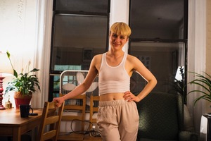 A relaxed young individual stands confidently in a cozy interior, illuminated by warm artificial light. The soft glow from a nearby lamp highlights their approachable expression, while the surrounding plants and furniture create a homely ambiance. The composition frames the figure against a backdrop of inviting domesticity, evoking a sense of comfort and intimacy.