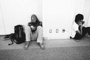 In this black-and-white photograph, two individuals sit against a stark white wall, absorbed in their devices. The soft lighting casts gentle shadows, emphasizing their isolation despite being in close proximity, echoing a mood of quiet introspection. The composition captures a modern disconnect, highlighting the contrast between physical presence and digital engagement.