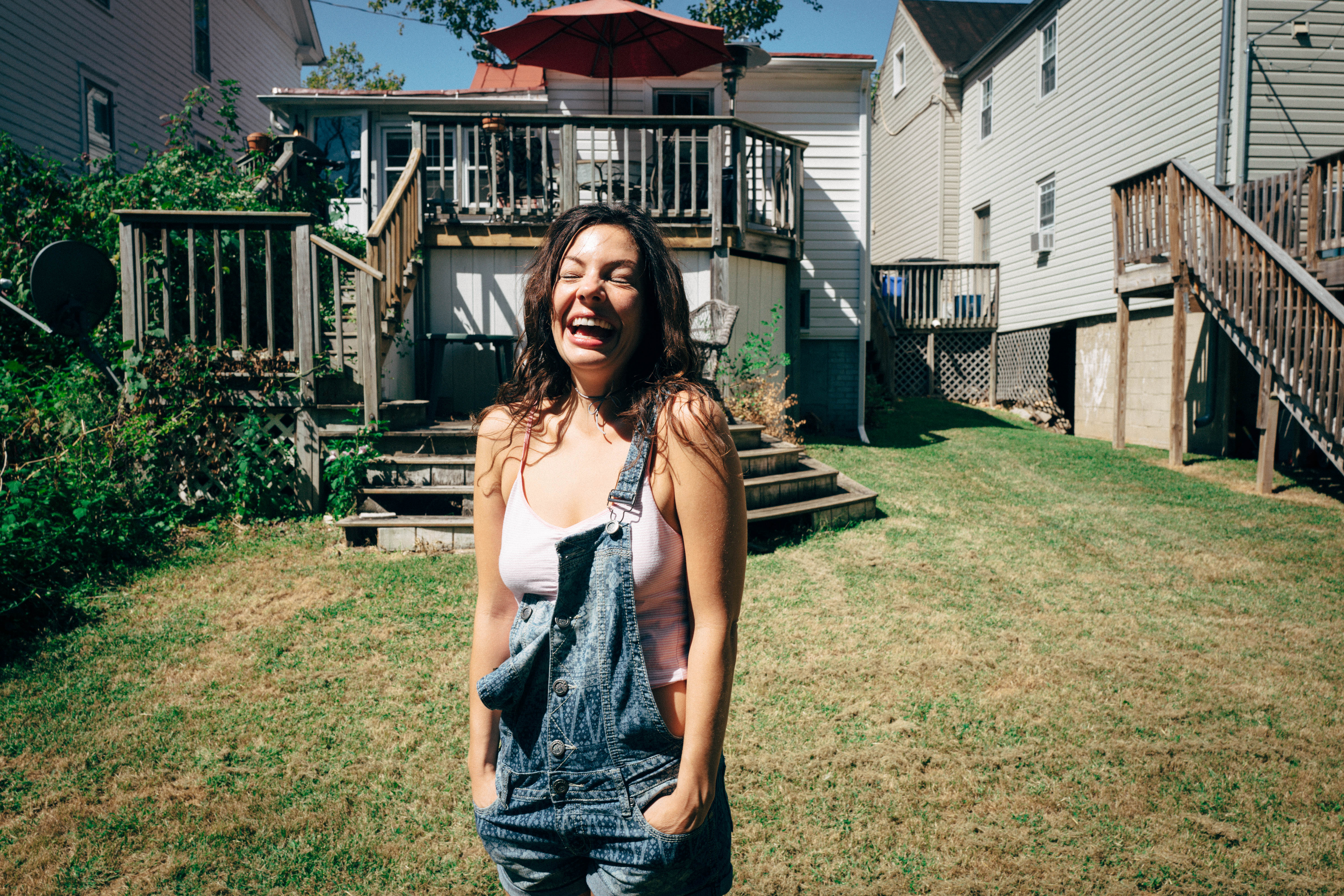A carefree woman stands smiling brightly in a sunlit backyard, dressed in denim overalls and a tank top. The warm, vibrant atmosphere is enhanced by the lush green grass and wooden decked surroundings, radiating a sense of happiness and spontaneity. Her infectious laughter captures the essence of a joyful summer afternoon, making the viewer feel the warmth and ease of the moment.