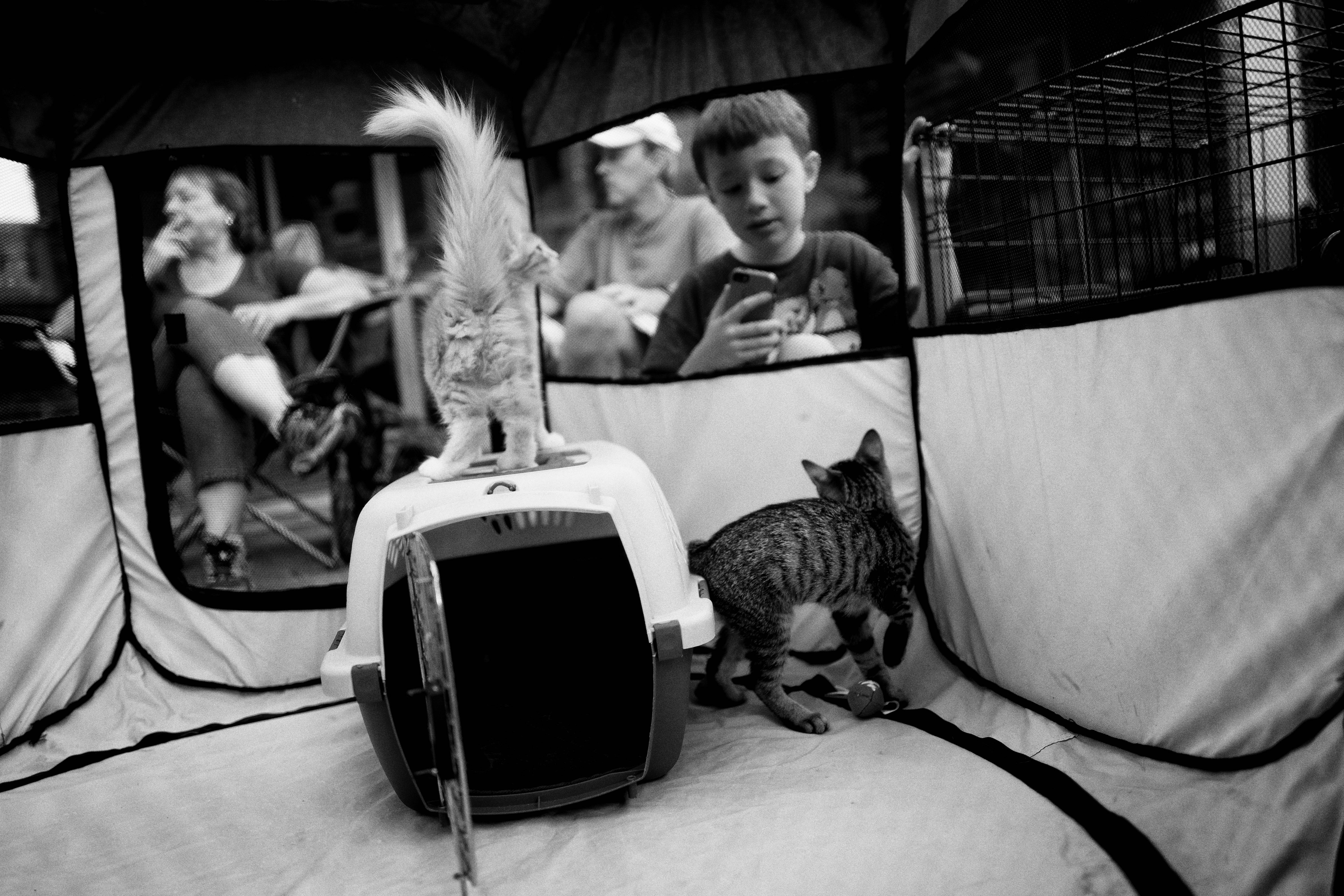 In a cozy tent, two curious kittens explore their surroundings, one playfully perched atop a carrier while the other investigates the floor. The scene, bathed in soft light, captures a moment of innocence and wonder, contrasting the relaxed adults in the background. This candid black-and-white shot evokes a sense of warmth and playful curiosity, immersing viewers in a delightful slice of life.