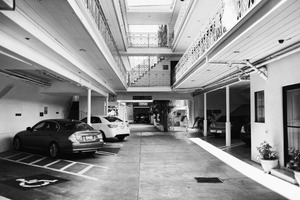 The photograph captures a serene parking area within a multi-level structure, featuring clean lines and an overhead skylight that invites natural light. The monochrome palette adds a timeless quality, enhancing the quiet mood of the space while emphasizing the orderly arrangement of parked cars. Subtle shadows contribute to the composition, drawing the viewer's eye toward the intriguing architectural details above.