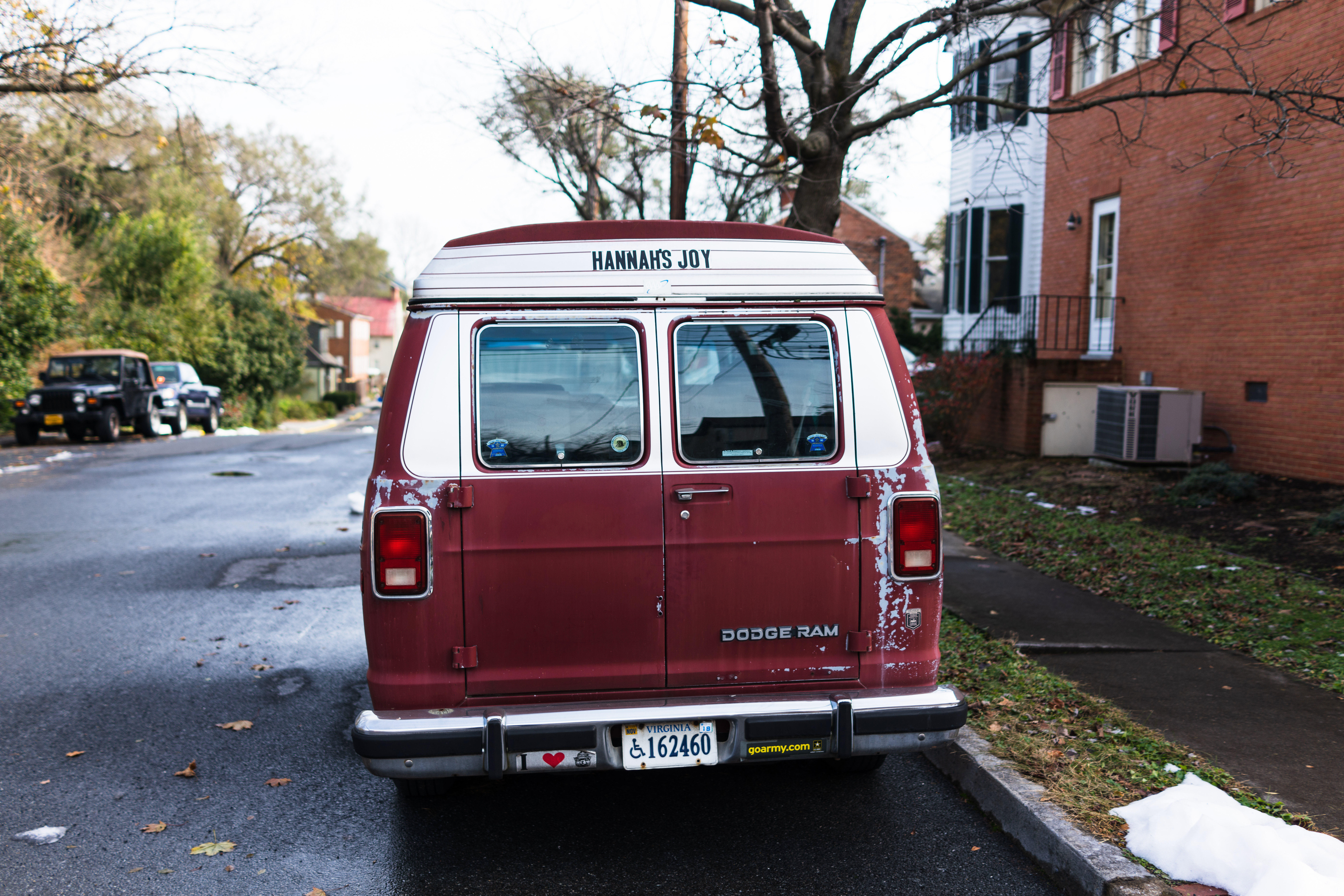 This photograph captures an old Dodge Ram van parked on a quiet street, its faded maroon paint and nostalgic stickers evoking a sense of warmth and nostalgia. The soft, diffused light of a cloudy day enhances the serene mood, while the scattered leaves and wet pavement suggest the recent arrival of autumn. Framed by the muted colors of nearby homes, the composition radiates a feeling of peaceful solitude and forgotten journeys.