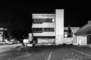 This stark black-and-white photograph captures an abandoned professional building, its façade marked by time and neglect. The mood is eerie and desolate, enhanced by the low nighttime lighting that casts deep shadows, revealing the architecture in haunting contrast. Overgrown vegetation and scattered debris hint at a forgotten past, inviting a sense of curiosity and mystery.