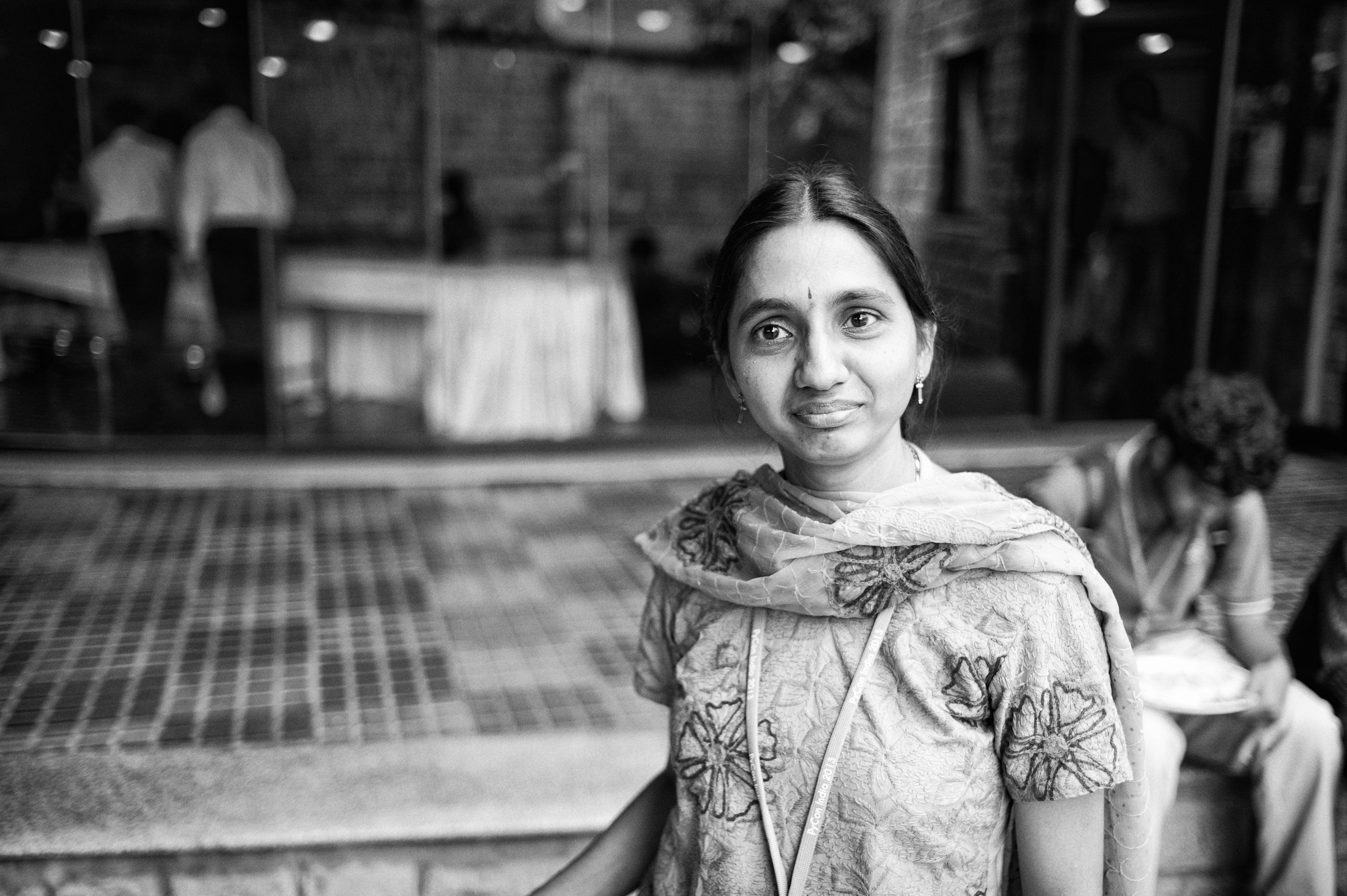 In this candid black-and-white photograph, a woman gazes at the camera with a gentle smile, embodying a tranquil elegance. The blurred background suggests a lively environment, juxtaposing her calm demeanor against the subtle bustle of life. Soft, natural light highlights her features and the intricate patterns of her attire, creating a warm and inviting mood.