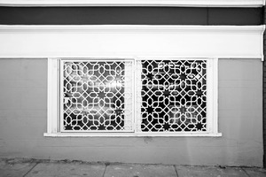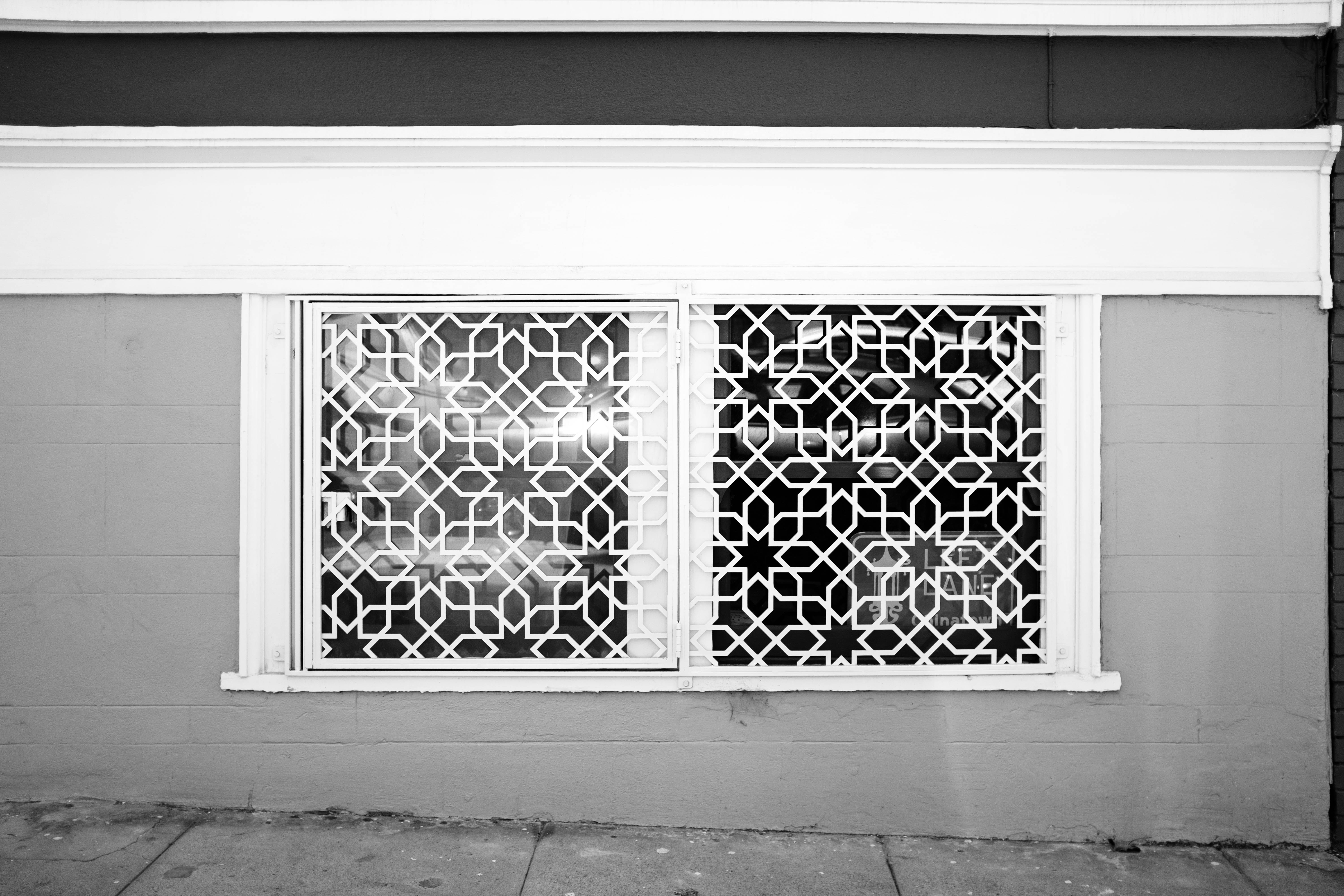 The photograph captures a striking black-and-white composition of a window adorned with intricate geometric patterns. Soft reflections play across the surface, creating a sense of depth and intrigue, while the muted tones contribute to a serene yet slightly melancholic atmosphere. The interplay of light and shadow emphasizes the texture of the window frame and its decorative grilles against the stark wall, inviting viewers to ponder what lies beyond.