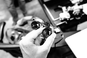 A hand delicately holds a pair of vintage eyeglasses, their reflective black lenses drawing the viewer’s attention. The monochrome palette enhances the moment's nostalgia, imparting a sense of curiosity and focus as it contrasts with the blurred surroundings. This intimate composition invites contemplation on perception and the tools that shape our vision of the world.