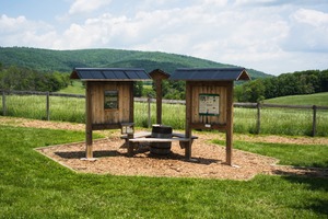 This photograph captures a serene outdoor information center nestled in a lush green landscape. The wooden structures, complemented by a round bench and surrounded by the vibrant grassy field, create a welcoming and informative atmosphere. Bright, diffused sunlight casts gentle shadows, enhancing the peaceful ambiance of nature in the background.