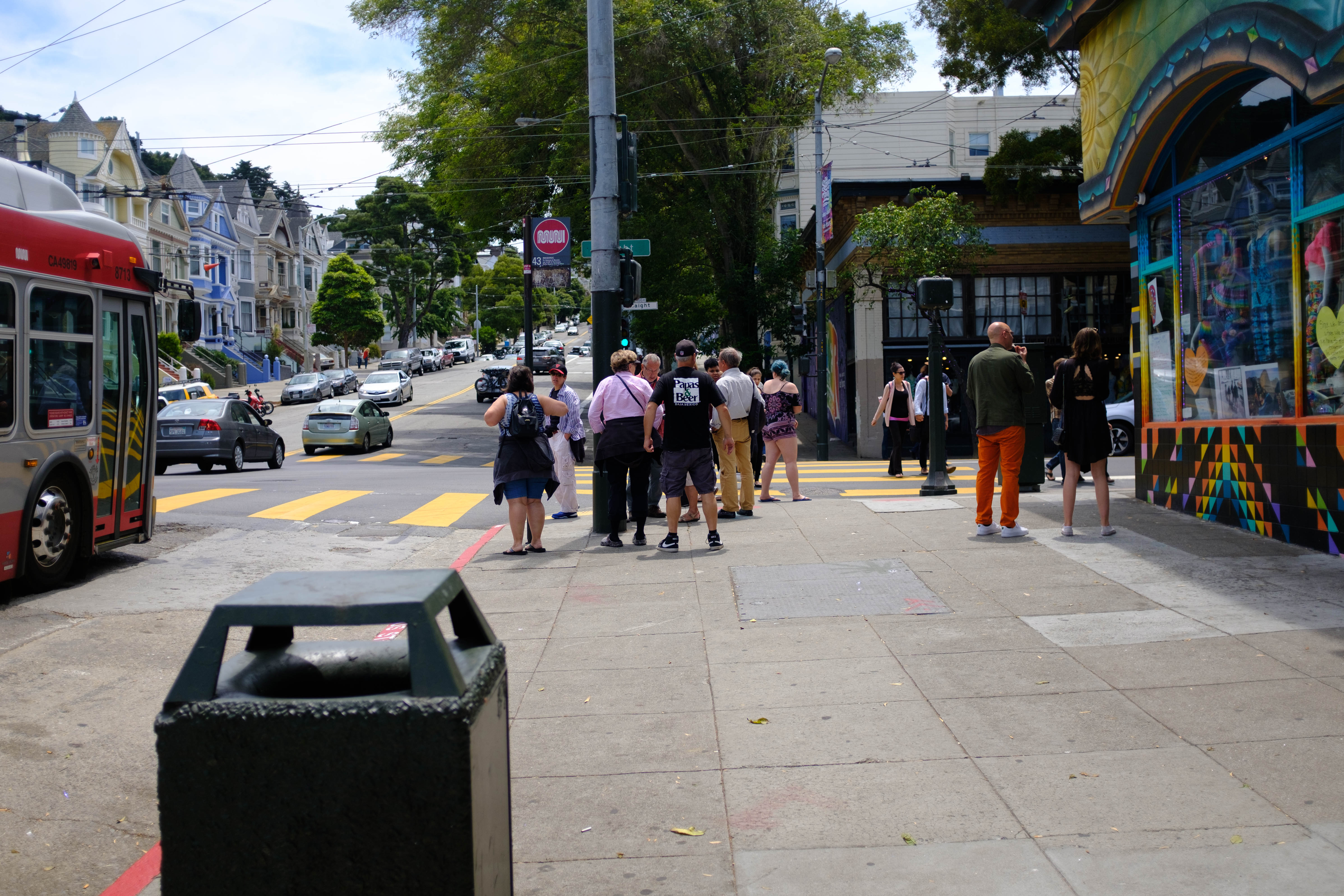 A bustling city scene captures a diverse group of pedestrians gathering at a crosswalk, framed by colorful murals and vintage architecture. The bright sunlight bathes the street in warmth, emphasizing a lively atmosphere. A city bus and passing cars add to the dynamic urban backdrop, creating a sense of motion and community.