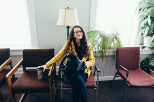 In a cozy waiting room filled with soft natural light, a young woman in a bright yellow jacket sits confidently among empty chairs. Her relaxed posture and gentle smile evoke a sense of ease and optimism. The green plants and warm lamp enhance the inviting atmosphere, creating a moment that feels both personal and peaceful.