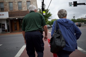 The photograph captures an elderly couple walking closely together along a city street, their backs turned towards the viewer. The muted tones of the scene, combined with the overcast sky, evoke a sense of intimacy and quiet companionship as they navigate their surroundings. The composition highlights the simplicity of their outing, with urban elements like signage and storefronts framing their leisurely journey.