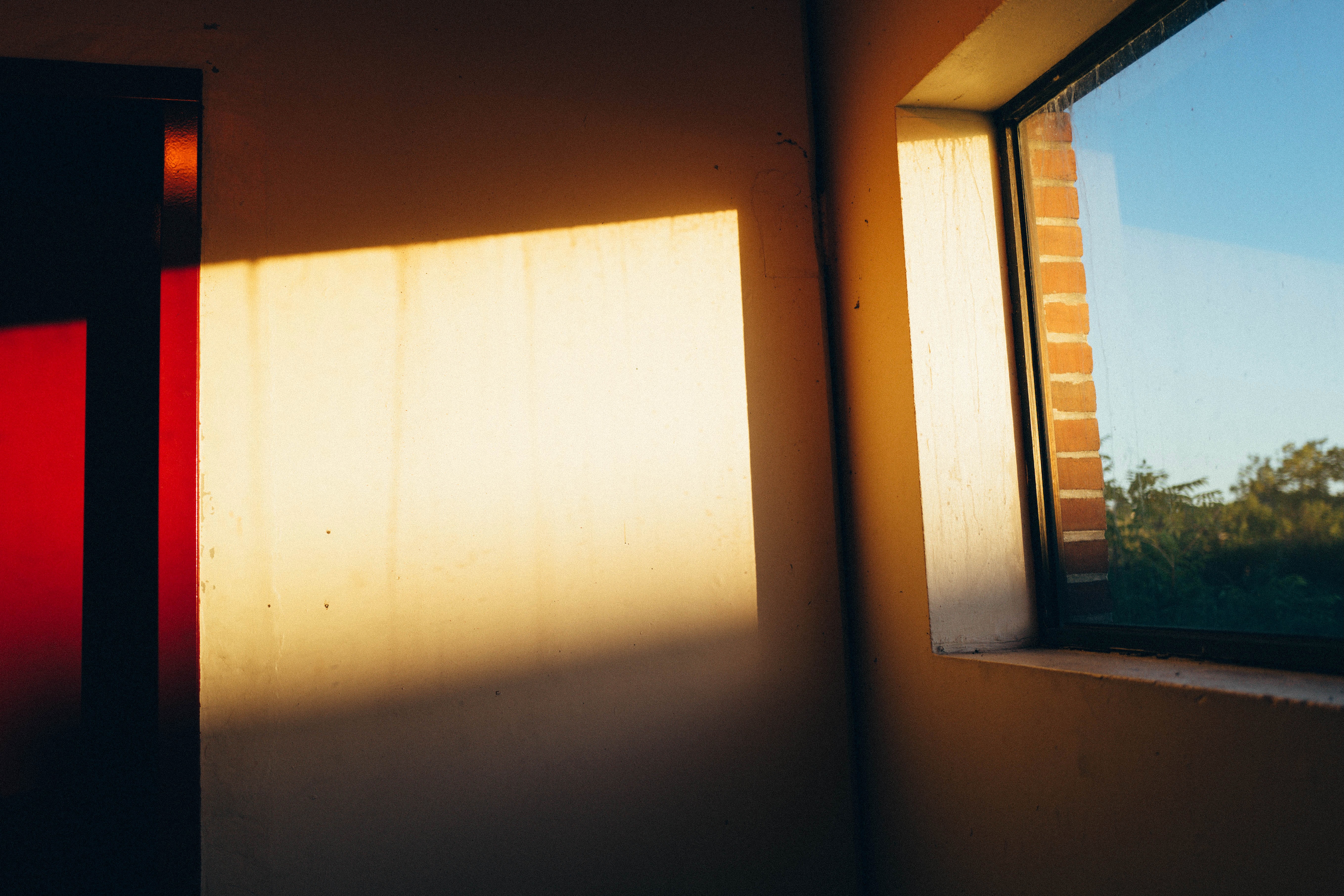 A soft interplay of light and shadow graces the interior, with warm sunlight streaming through a window and casting a gentle beam across the wall. The subtle contrast between the textures of the walls and the inviting view outside evokes a sense of tranquility and contemplation. The minimalistic composition invites the viewer to pause and reflect on the quiet beauty of everyday surroundings.