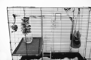 This black-and-white photograph captures the stark interior of a small animal cage, filled with simple items like hanging toys and a feeding tray. The composition emphasizes the cage's structure, creating a sense of confinement that evokes feelings of loneliness and stillness. Soft light casts gentle shadows, enhancing the mood of quiet introspection within this enclosed space.