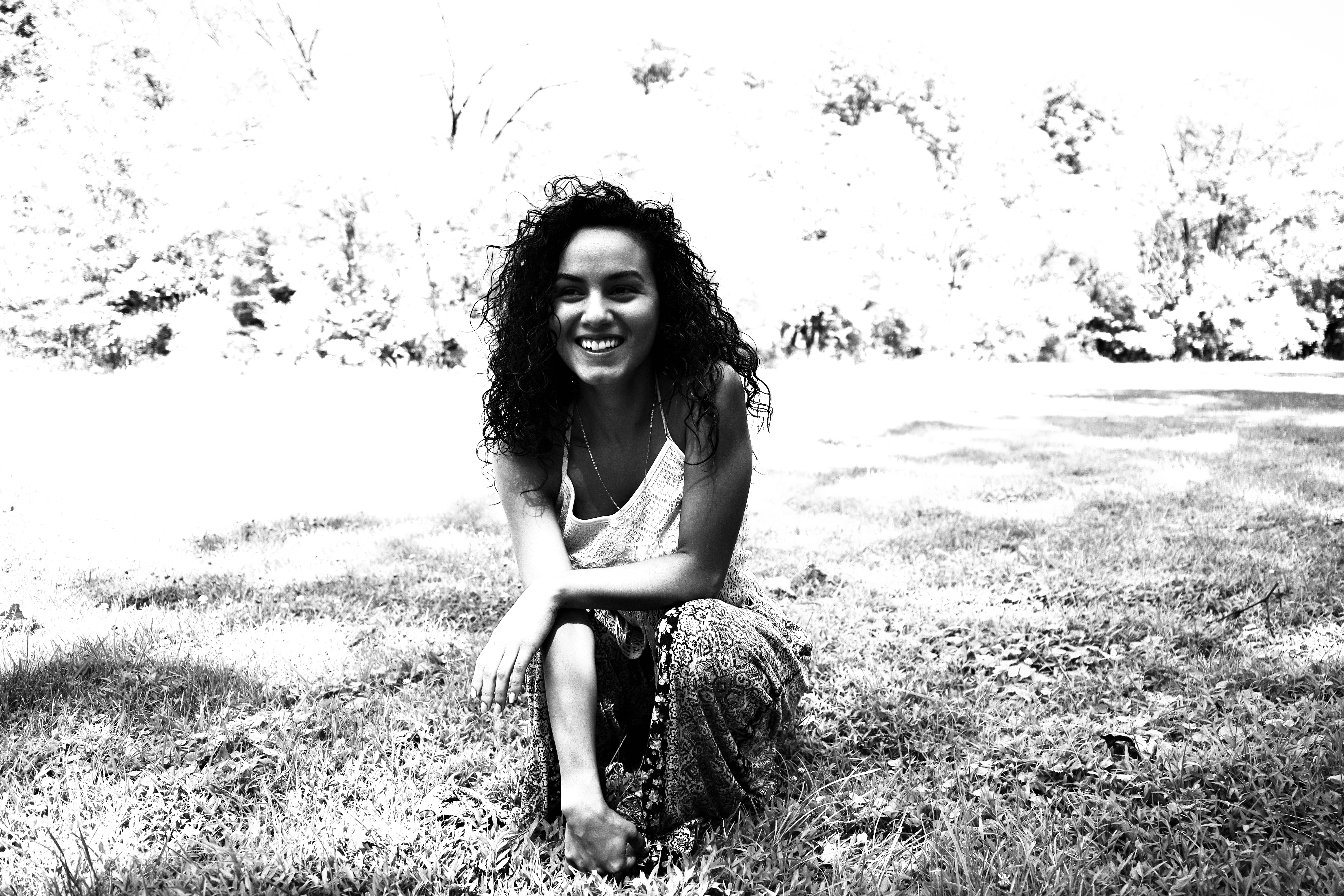 The photograph captures a young woman with curly hair sitting on a grassy field, exuding warmth and happiness as she smiles brightly. The high-contrast black-and-white composition enhances the playful mood, with soft, diffused lighting illuminating her face while the background fades to a bright blur. The relaxed, casual pose invites an atmosphere of tranquility and joyous spontaneity.