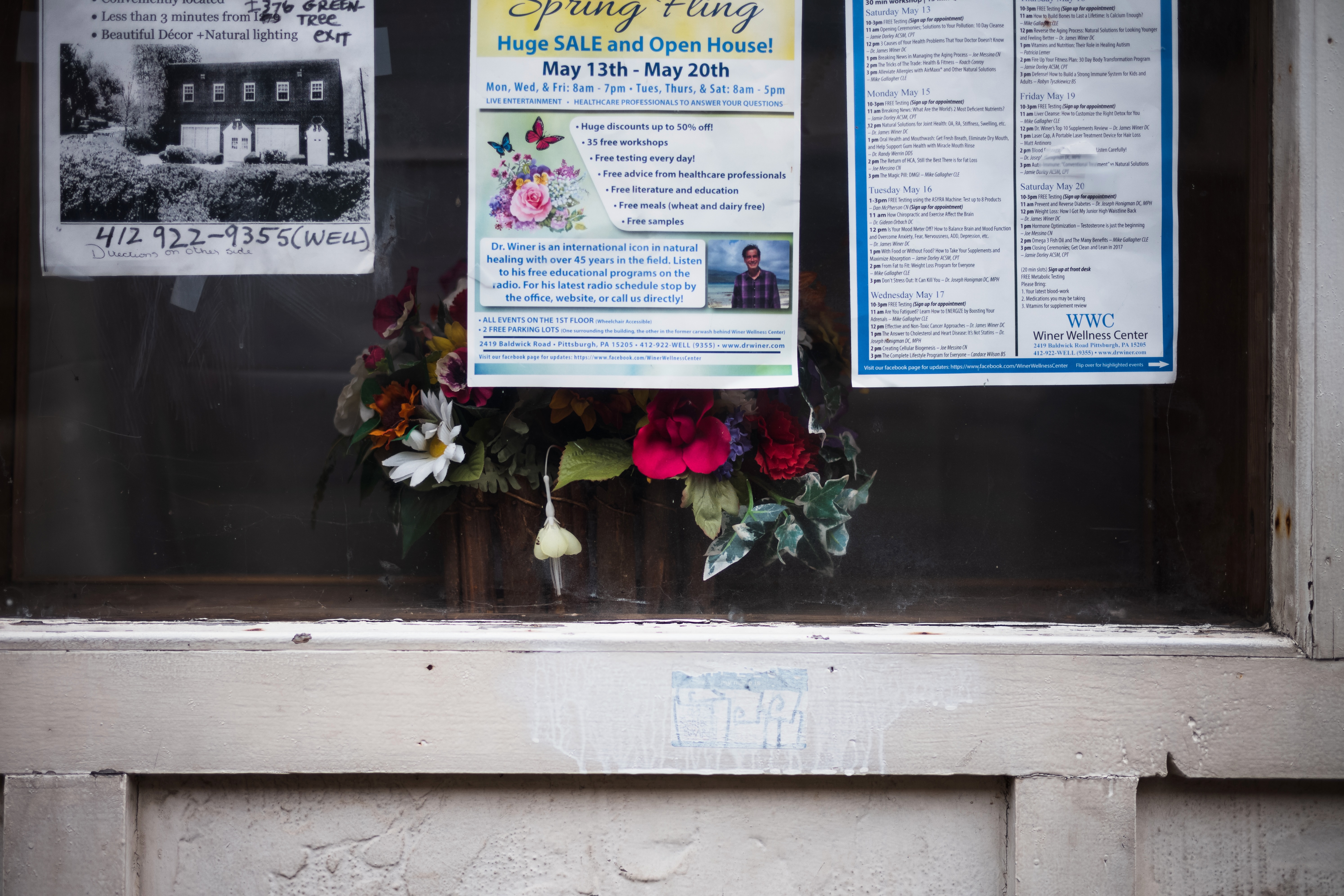 Through a weathered window, colorful flyers beckon attention amidst a backdrop of artificial flowers. The composition captures a sense of nostalgia and community, with soft, diffused lighting that enhances the inviting yet slightly melancholic mood of a small town storefront. Contrasting textures of paper and plastic evoke a layered story of local events and forgotten beauty.