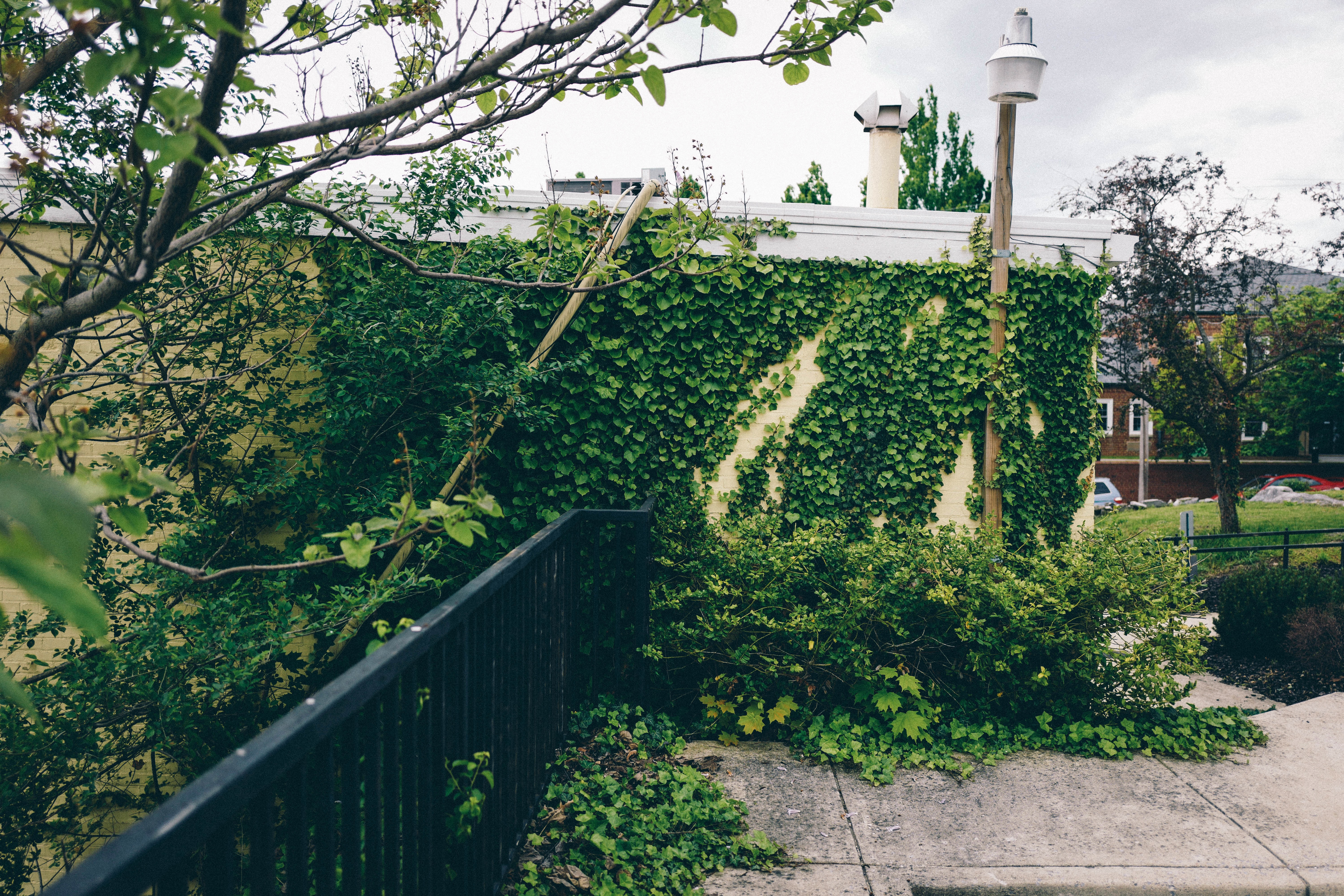 This photograph captures an inviting corner of greenery, where a vibrant carpet of ivy clings to a rustic wall, softened by surrounding foliage. The muted daylight creates a calm atmosphere, highlighting the rich textures of the leaves against the pale background, while the iron railing provides a contrasting structure that frames the natural beauty. The overall composition evokes a sense of serenity and nature's reclamation of space.