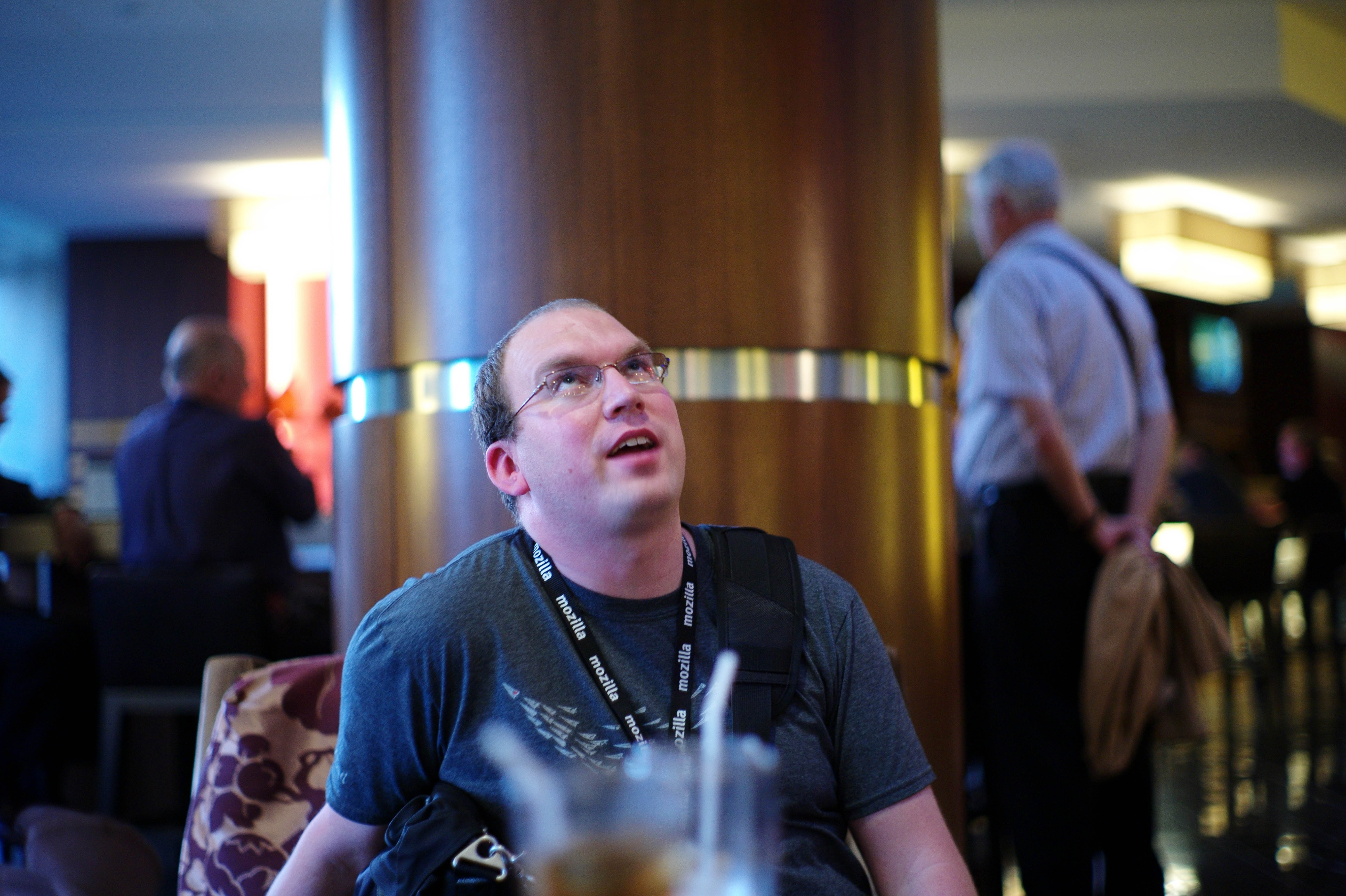 In a softly lit lounge, a man gazes upward, lost in thought, his expression a mix of wonder and curiosity. The ambient lighting casts a warm glow, accentuating the cozy yet vibrant atmosphere, while the blurred figures in the background emphasize his introspective moment. The composition captures a fleeting instance of contemplation amidst the bustle of a social space.