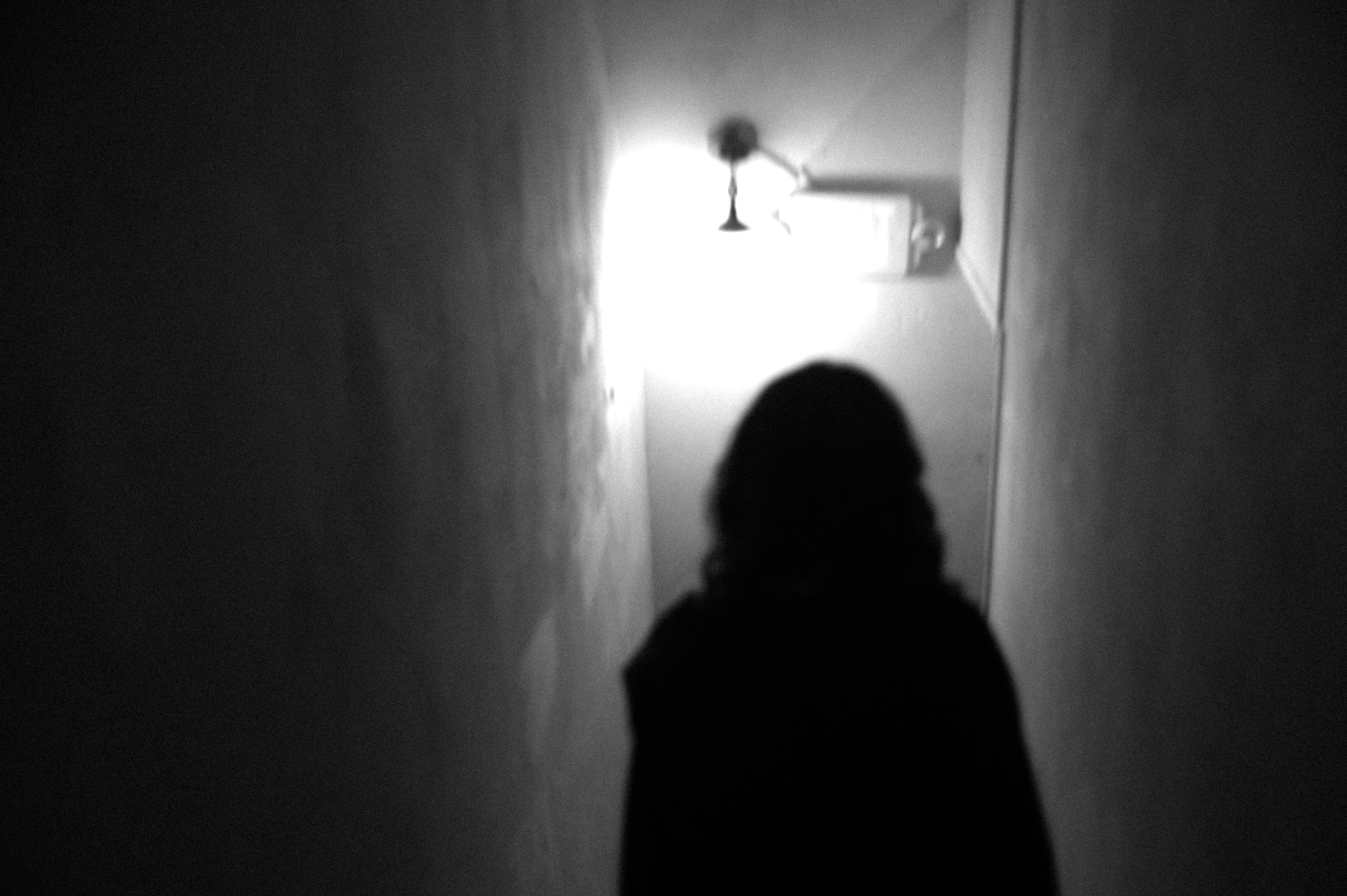 A solitary figure descends a narrow, dimly-lit stairwell, enveloped in shadows. The stark black-and-white contrast highlights the emotional tension, creating an atmosphere of mystery and introspection. Light spills from an overhead fixture, casting a haunting glow that draws the viewer’s eye towards the unknown below.