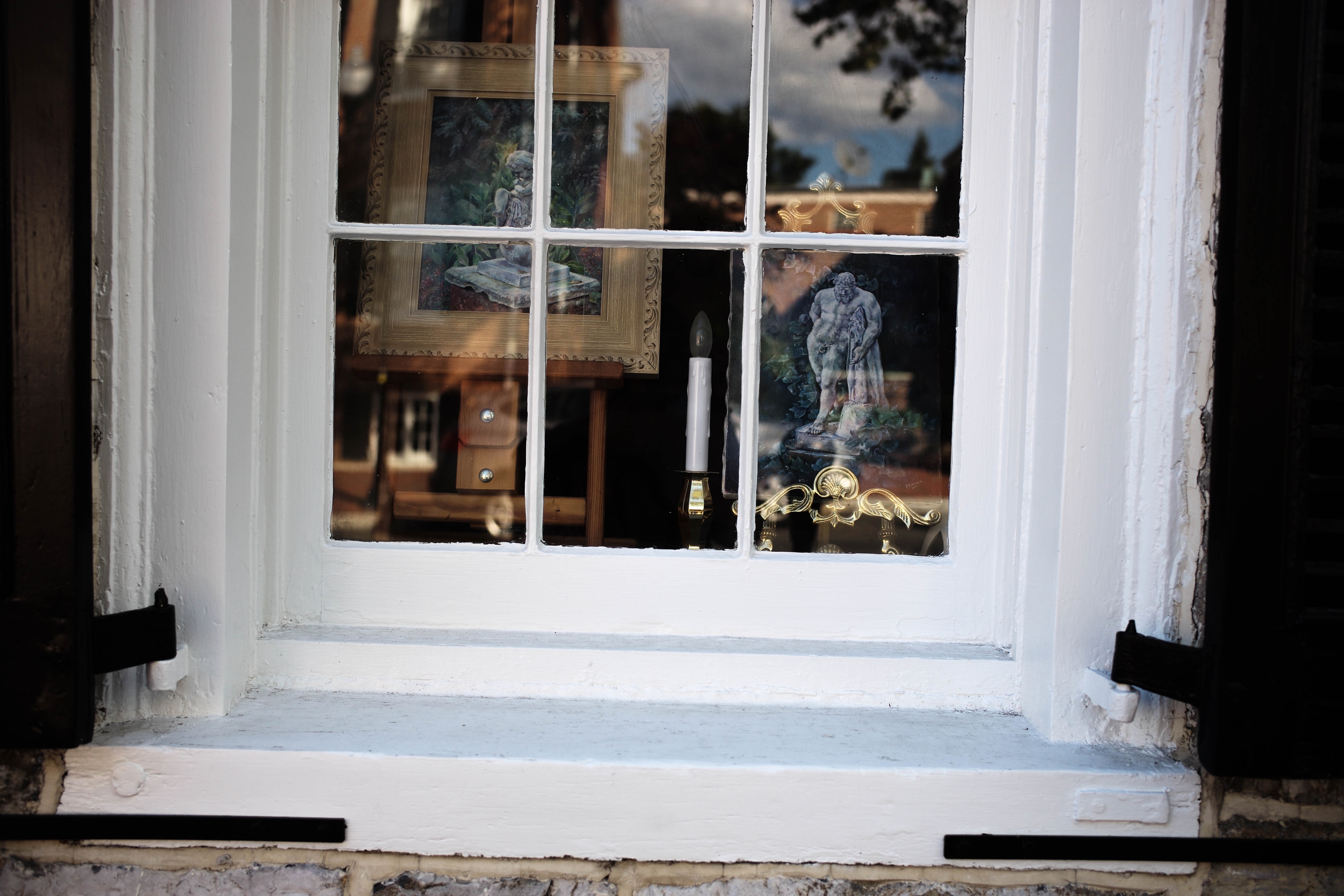 The photograph captures a glimpse through a rustic window, framed with time-worn shutters, showcasing a collection of art and artifacts. Soft sunlight filters through the glass, illuminating a delicate interplay of shadows and reflections that evoke a sense of nostalgia. The mix of textures and colors within the display creates an intimate ambiance, inviting the viewer to contemplate the stories behind the objects within.