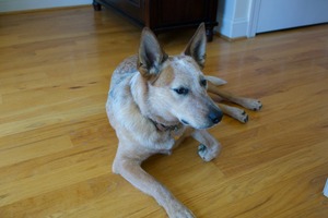 A relaxed dog lies on a warm wooden floor, exuding a sense of calm and contentment. The soft lighting highlights the dog's features, creating a serene atmosphere that invites tranquility. The composition centers the dog, allowing its thoughtful expression and poised posture to draw the viewer in.