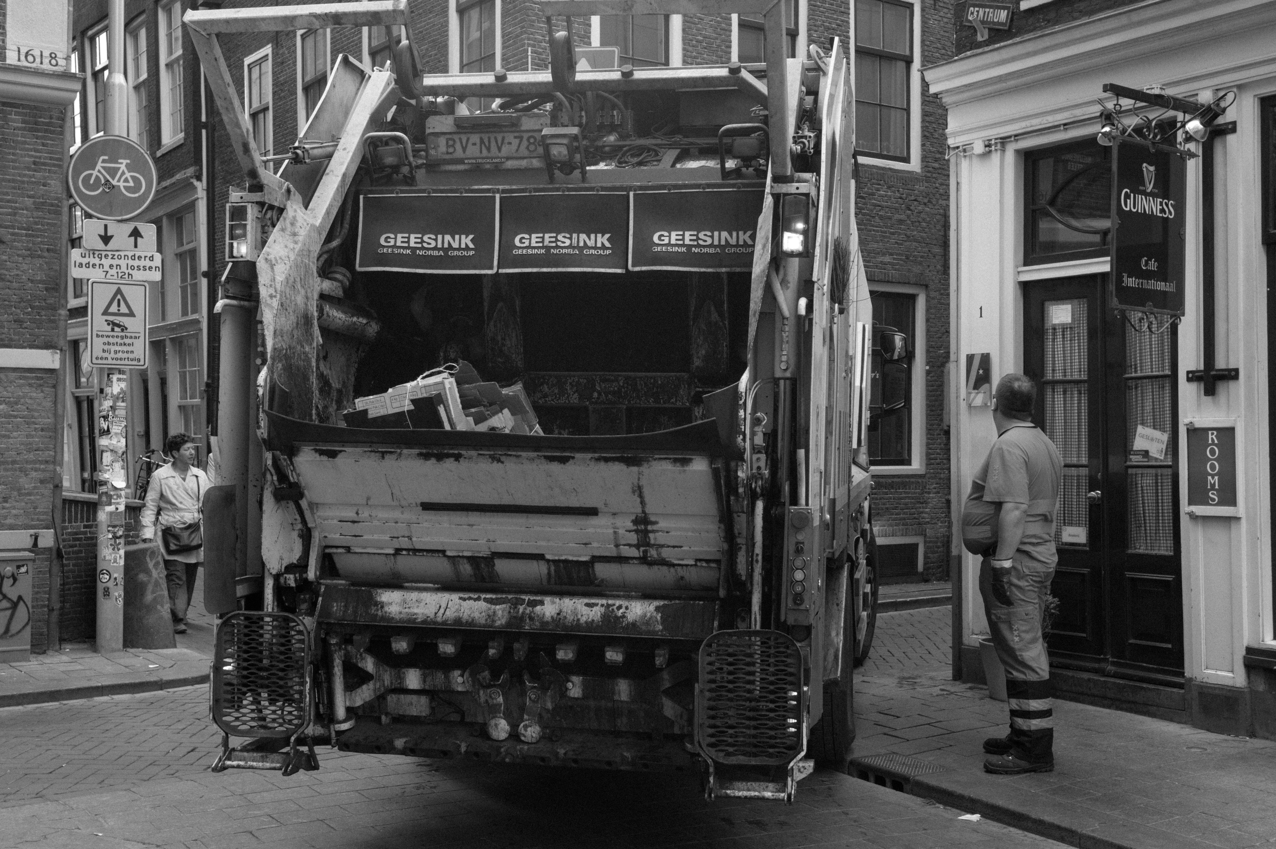 The photograph captures a moment of everyday life in a bustling urban setting, showcasing a garbage truck positioned in the narrow street, its back gate open, revealing the clutter within. The interplay of light and shadow highlights the contrast between the mundane task of waste collection and the surrounding architecture, evoking a sense of both routine and urban fatigue. A few pedestrians, including a curious woman and an observant worker, add a human element, bringing life to this otherwise gritty scene.