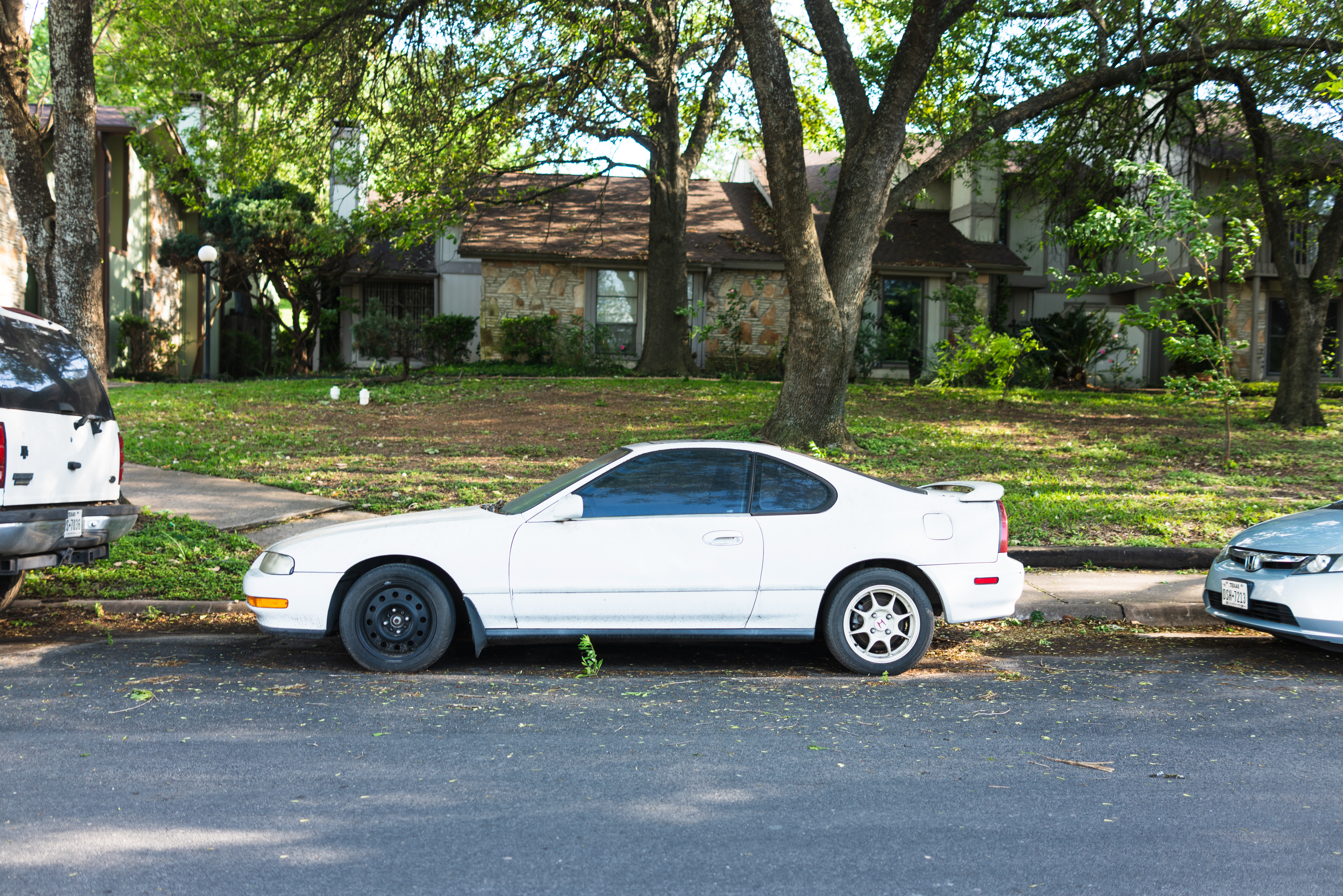 A white car, parked serenely on a tree-lined street, captures a moment of everyday life. The dappled sunlight filters through the lush greenery, creating a calm and reflective atmosphere. The backdrop of a rustic house adds a touch of warmth, emphasizing the harmony between urban living and nature.