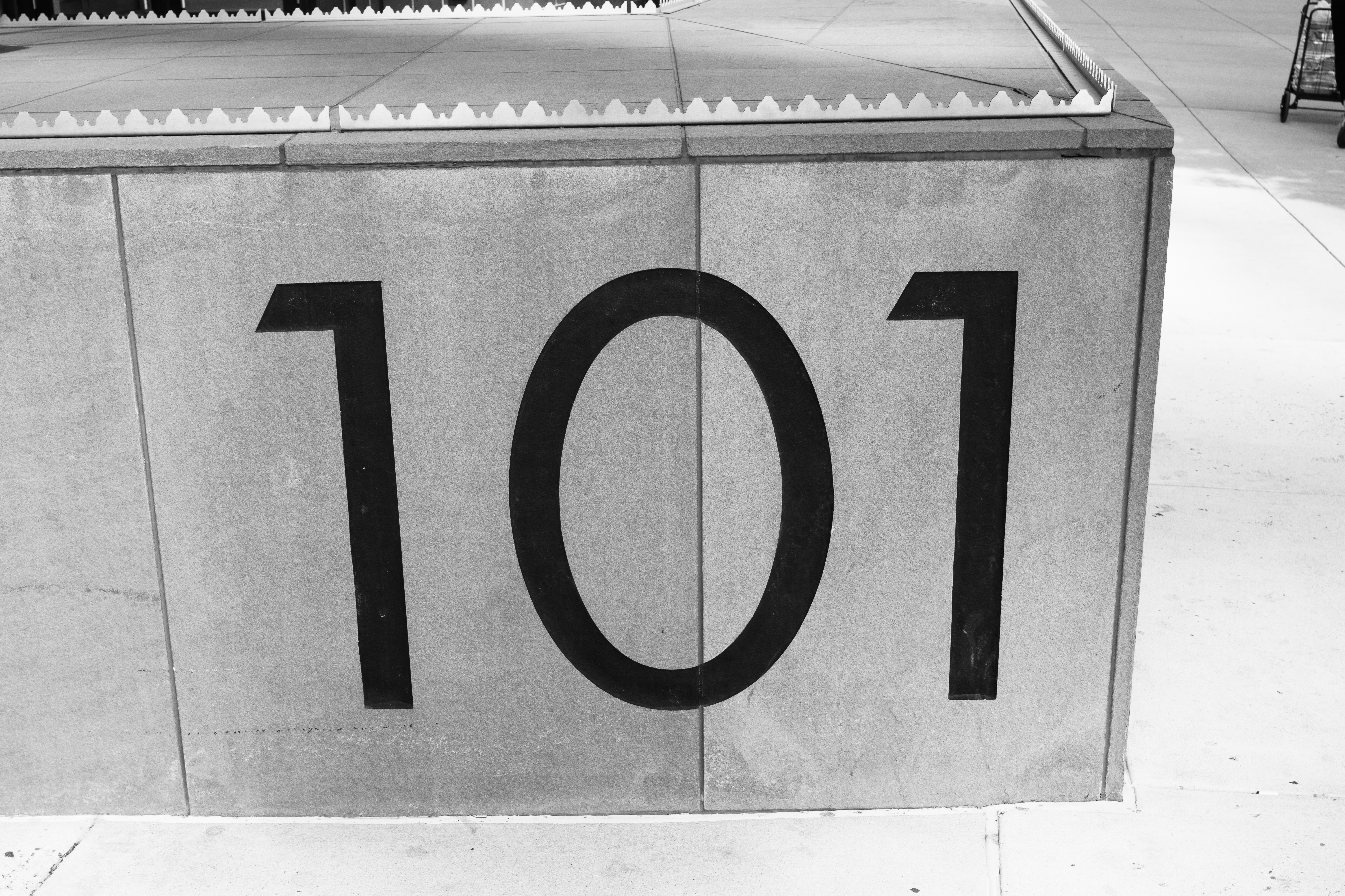 The photograph presents a stark, close-up view of the number '101' etched on a stone block, emphasizing simplicity and architectural elegance. The black-and-white palette enhances the mood of contrast, drawing attention to the bold figures against a textured background. Lighting plays a subtle role, casting soft shadows that add depth while maintaining the overall minimalist aesthetic.