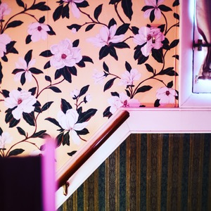 The photograph captures a stylish staircase framed by vibrant floral wallpaper in soft pinks and greens, evoking a sense of nostalgia and elegance. Warm, diffused light spills onto the scene, casting gentle shadows that enhance the intricate patterns of the wallpaper. The composition leads the viewer’s gaze upward, inviting exploration of the charming, vintage atmosphere.