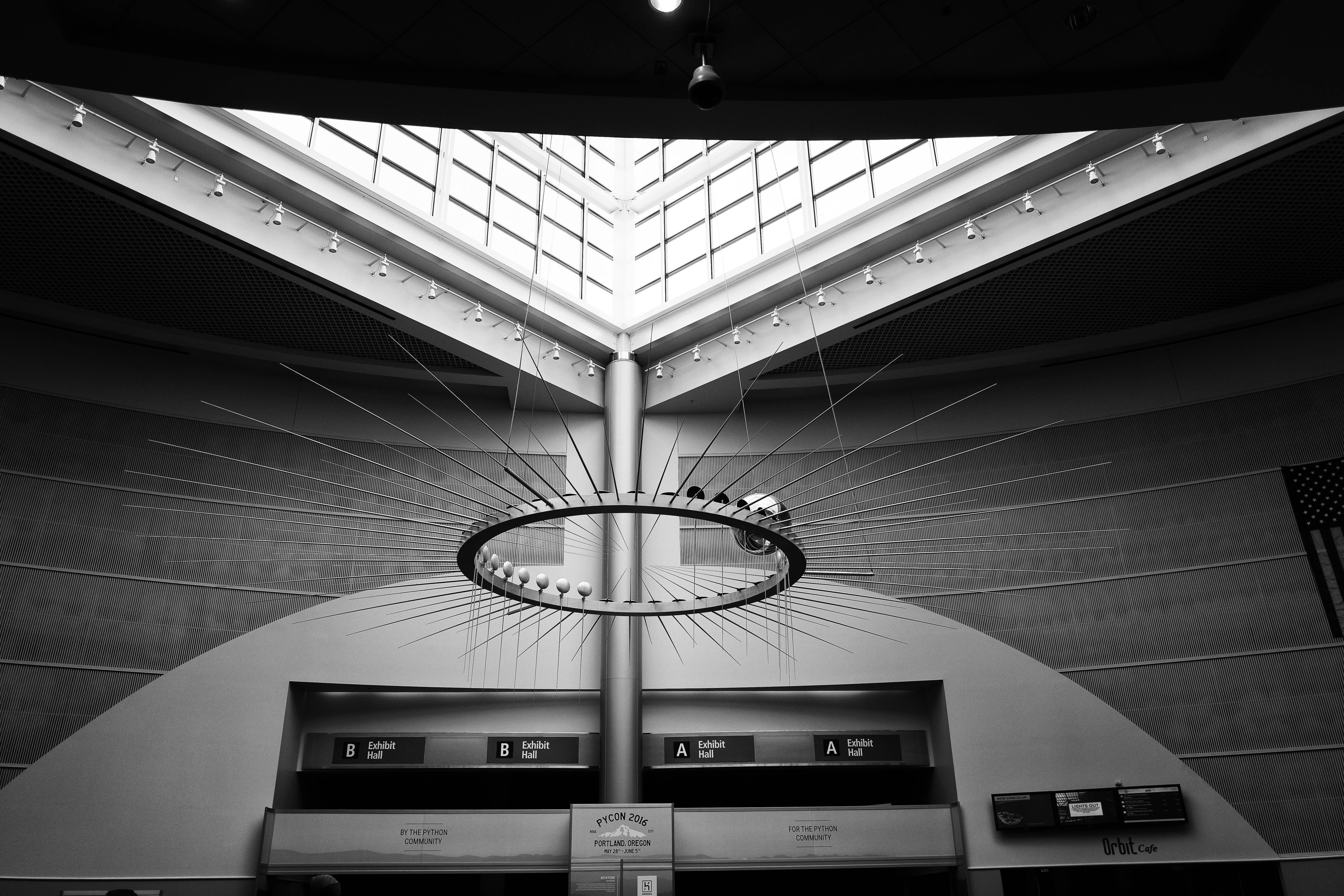 This striking black-and-white photograph captures an expansive interior with a dramatic circular light fixture radiating outwards, evoking a sense of both grandeur and tranquility. The interplay of lines from the fixture and the architecture creates a dynamic yet harmonious composition, while natural light streams in from above, enhancing the ethereal mood. The result is a space that feels both inviting and contemplative, drawing the viewer's eye upward.