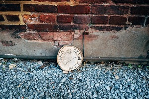 A wooden slice rests against a weathered brick wall, its carved message provoking curiosity and a hint of humor. The muted tones of the surrounding gravel contrast with the natural textures of the wood, adding a rustic charm. The natural light creates soft shadows, enhancing the contemplative mood of this unexpected urban artifact.