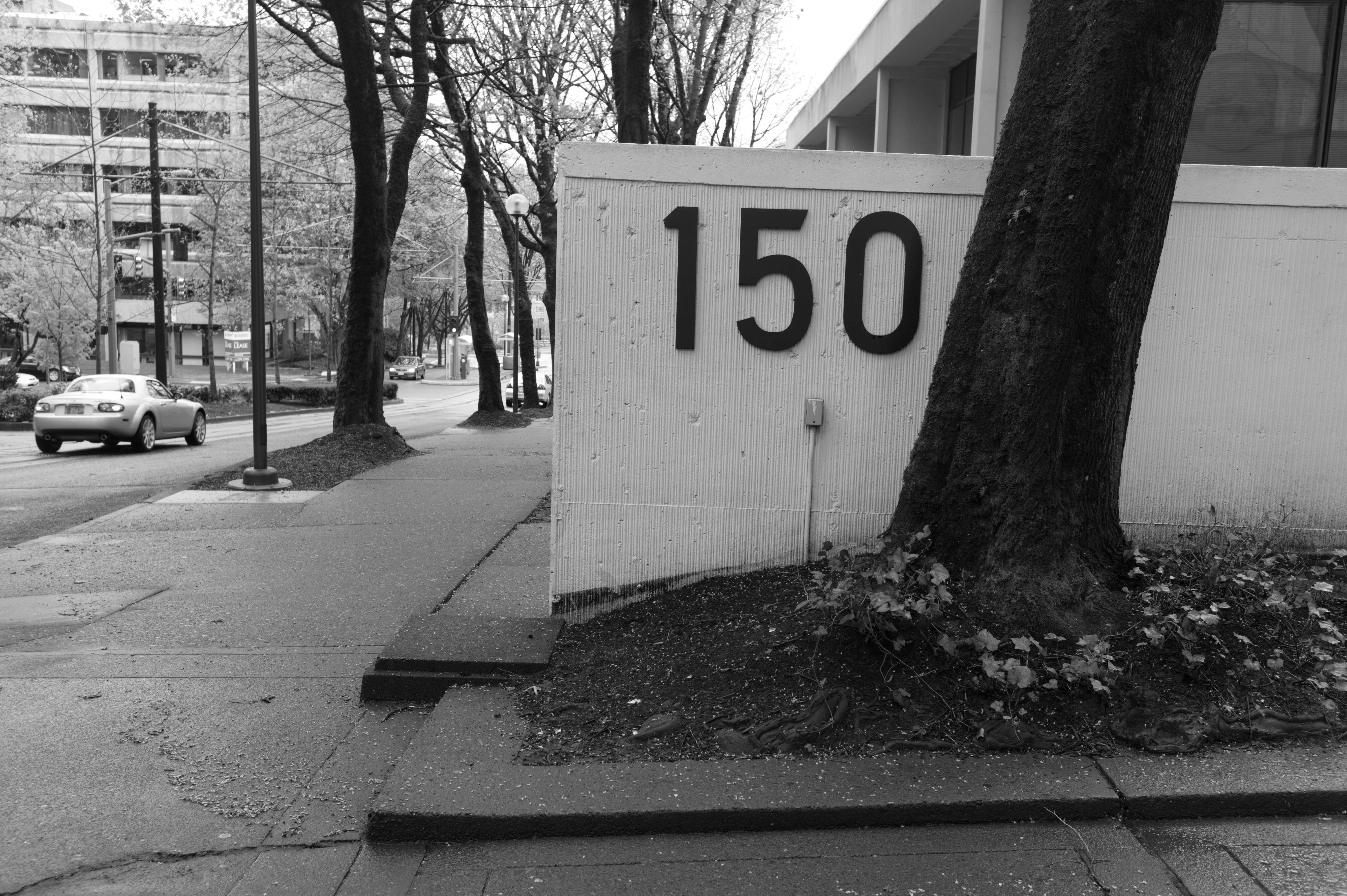 The photograph captures a quiet urban scene, focusing on a stark white wall inscribed with the number '150'. Shadows from nearby trees interplay with the muted tones of the street, enhancing a contemplative mood. The composition draws the eye down the sidewalk, where a lone car sits, suggesting a moment of stillness amidst city life.
