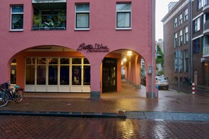 The photograph captures a vibrant pink building, home to 'Betty Blue,' with its inviting arches framing a damp, cobbled street. Soft lighting emanates from within, creating a warm ambiance amidst the evening rain. Bicycles lean casually against the wall, adding a touch of everyday life to this tranquil urban scene.