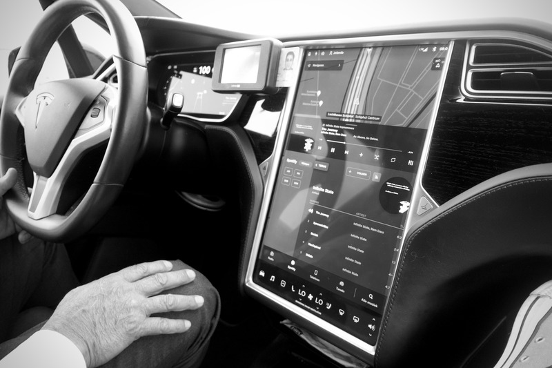 The photograph captures the sleek interior of a Tesla, highlighting the prominent dashboard and steering wheel. The juxtaposition of light and shadow, along with the monochromatic tones, evokes a sense of modernity and sophistication, emphasizing the technological advancements within the vehicle. A hand rests lightly on the steering wheel, suggesting a moment of contemplation in this high-tech driving experience.