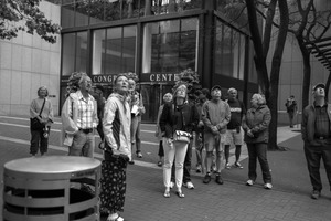 A diverse group of people gazes upwards in a city square, their expressions a mix of wonder and intrigue. The composition captures their collective attention, enhanced by the monochromatic palette that emphasizes the textures of their clothing and the surrounding architecture. Soft, diffuse lighting casts gentle shadows, creating an atmosphere of contemplation and shared discovery.