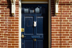 The photograph captures a striking dark blue door adorned with a whimsical door knocker, set against a rich red-brick wall. Sunlight illuminates the scene, creating a warm, inviting atmosphere that contrasts with the door's slightly weathered appearance. The intricate details and vibrant colors evoke a sense of history and charm, inviting curiosity about what lies beyond.