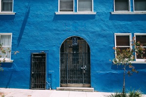 This photograph captures a striking blue wall adorned with two unique doorways, one arching majestically while the other remains small and unassuming. Sunlight bathes the scene, enhancing the vividness of the color and creating dynamic shadows that add depth. The overall mood is cheerful and inviting, evoking a sense of curiosity about the stories hidden behind the doors.
