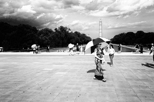 The photograph captures a sunlit plaza bustling with visitors, highlighted by a woman gracefully walking with a distinct black and white striped umbrella that contrasts against a backdrop of looming clouds. The composition draws the eye to the iconic obelisk in the distance, while the dynamic interplay of light and shadow evokes a sense of both vibrancy and contemplation. The overall mood is a blend of leisure and anticipation, inviting viewers to share in the moment of exploration and history.