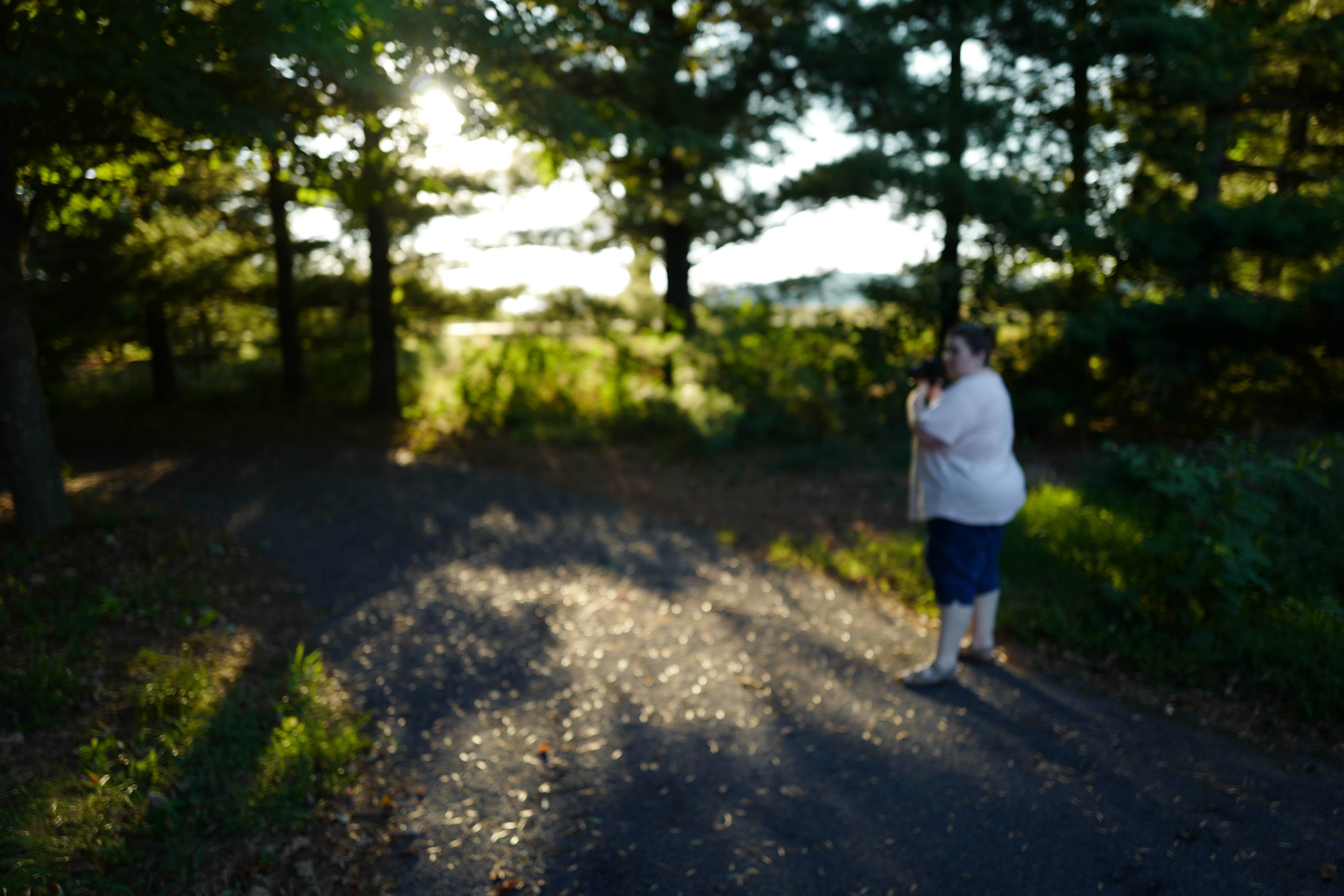 A figure stands quietly on a winding path, partially obscured by gentle shadows and the soft glow of early sunlight filtering through dense trees. The blurred focus adds a dreamlike quality, enhancing the serene mood of the scene, as golden rays dance on the ground, inviting viewers to step into this tranquil moment. The composition captures a sense of solitude and connection to nature, evoking feelings of calm and reflection.