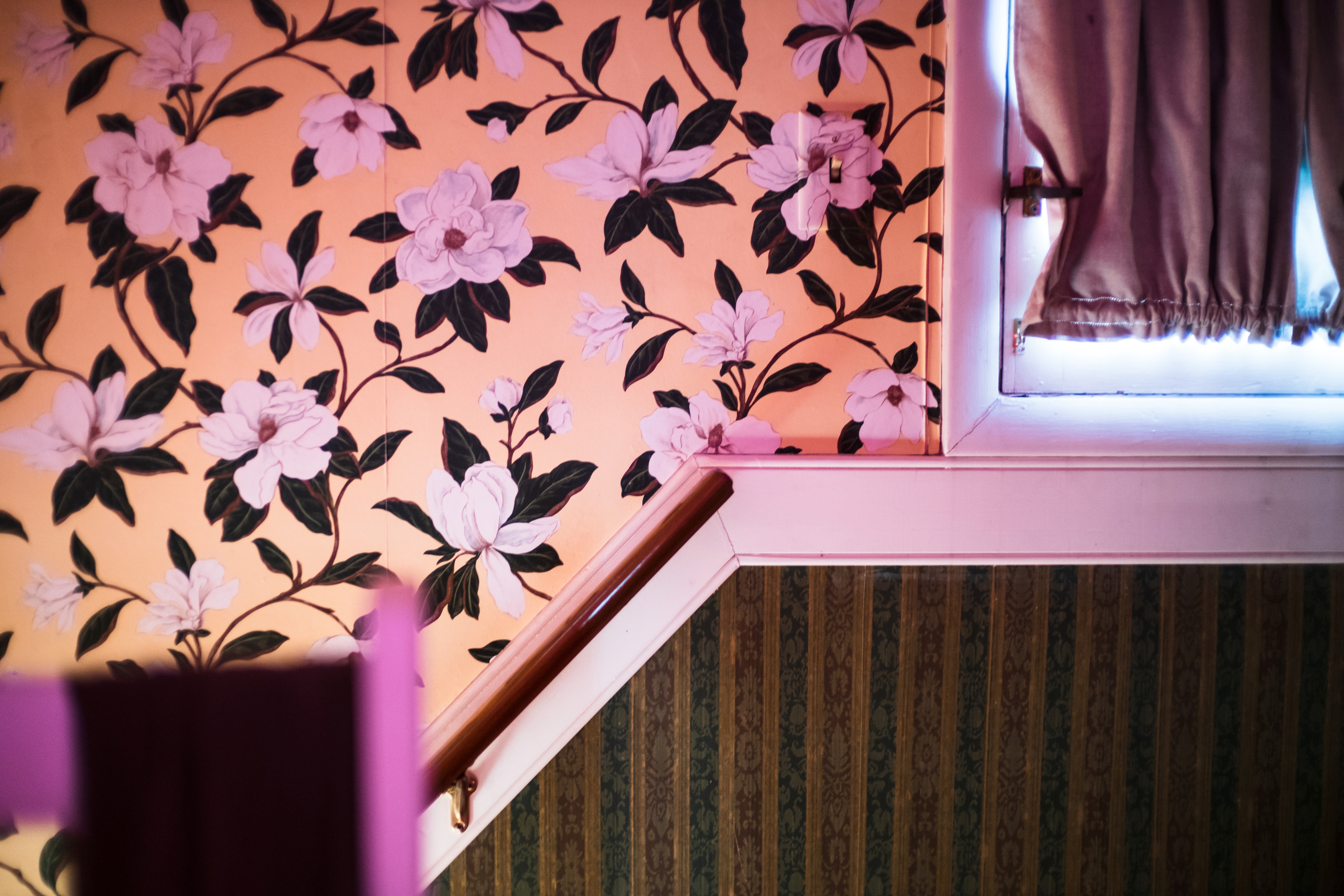 This photograph captures the gentle intersection of vintage floral wallpaper and a soothingly lit window, evoking a sense of nostalgia and tranquility. The warm hues of the wall contrast with the cool light filtering through the curtain, creating a dreamlike ambiance. The composition leads the eye upward along the staircase, inviting exploration and reflection in an intimate space.
