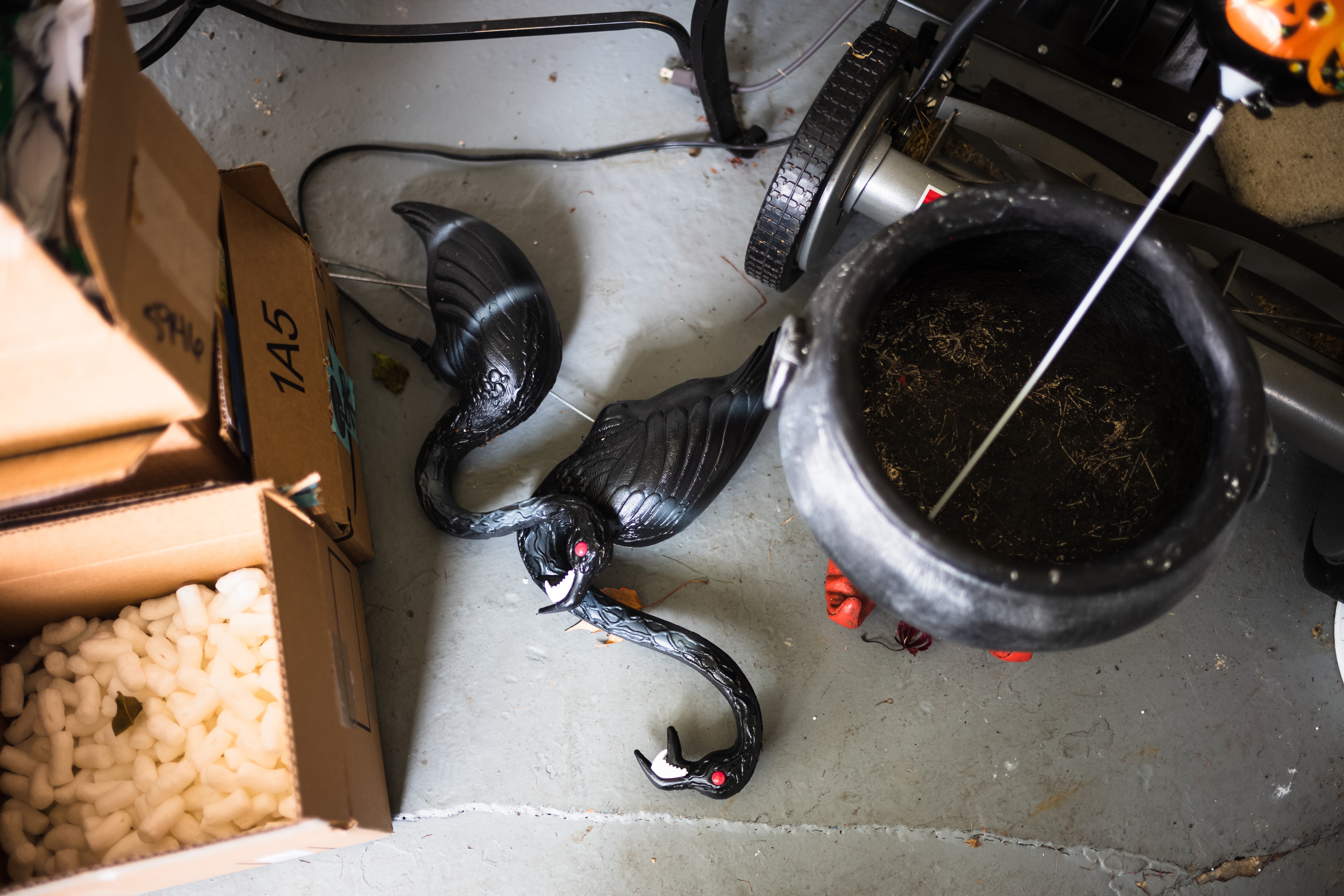In a dimly lit garage, a pair of whimsical black swan decorations lay discarded on the floor, their glossy feathers catching sporadic light. Surrounding them are cardboard boxes filled with packing peanuts, hinting at a disordered space filled with remnants of past celebrations. The atmosphere combines a sense of nostalgia with an eerie undertone, as the dark colors and clutter evoke a haunting charm.