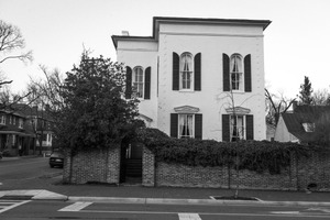 This photograph captures a stately, historic house with a stark white facade and classic architectural features, embraced by lush greenery. The black-and-white tone enhances its timeless appeal, creating a moody atmosphere that evokes nostalgia. Soft, diffused light accentuates the texture of the bricks and the surrounding foliage, creating a sense of serenity and permanence.