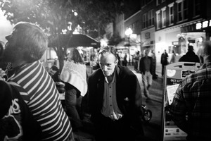 A somber figure walks through a bustling street scene, contrasting the lively background with his solemn expression. The photograph captures the interplay of shadows and highlights, emphasizing the loneliness amidst a crowd, evoking a sense of introspection. The black-and-white composition enhances the mood, creating a raw, gritty urban atmosphere.